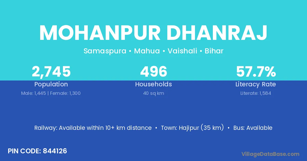 Hajipur (35 km) is the nearest town to Mohanpur Dhanraj village for major economic activities and is located approximately 35 km away.