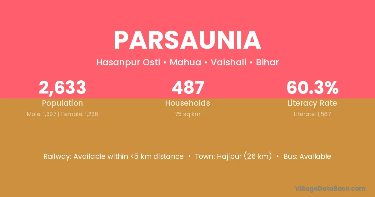 Hajipur (26 km) is the nearest town to Parsaunia village for major economic activities and is located approximately 26 km away.