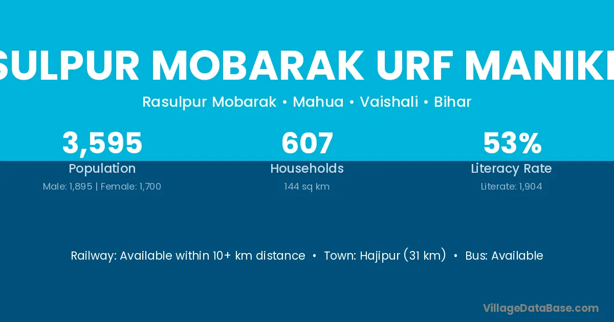 Rasulpur Mobarak Urf Manikpur village has a total population of 3,595 people, of which 1,895 are males and 1,700 are females.
