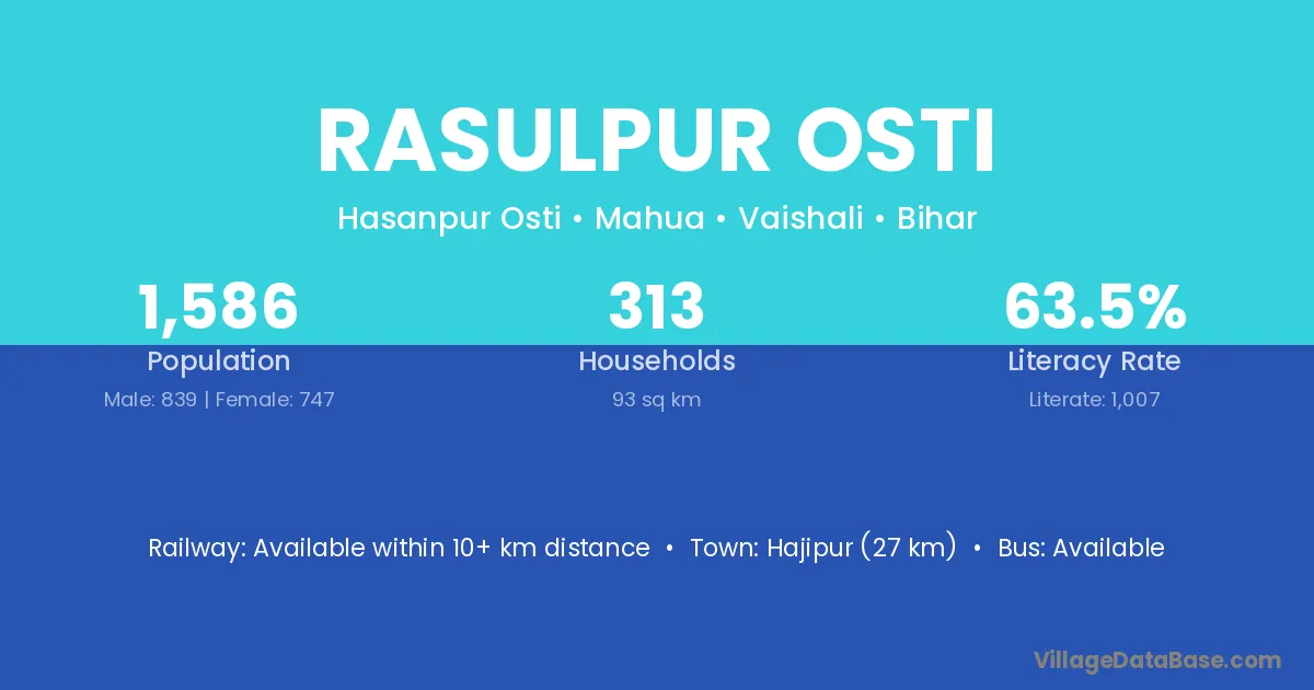 Hajipur (27 km) is the nearest town to Rasulpur Osti village for major economic activities and is located approximately 27 km away.