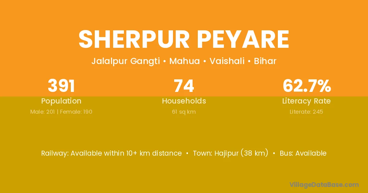 Hajipur (38 km) is the nearest town to Sherpur Peyare village for major economic activities and is located approximately 38 km away.
