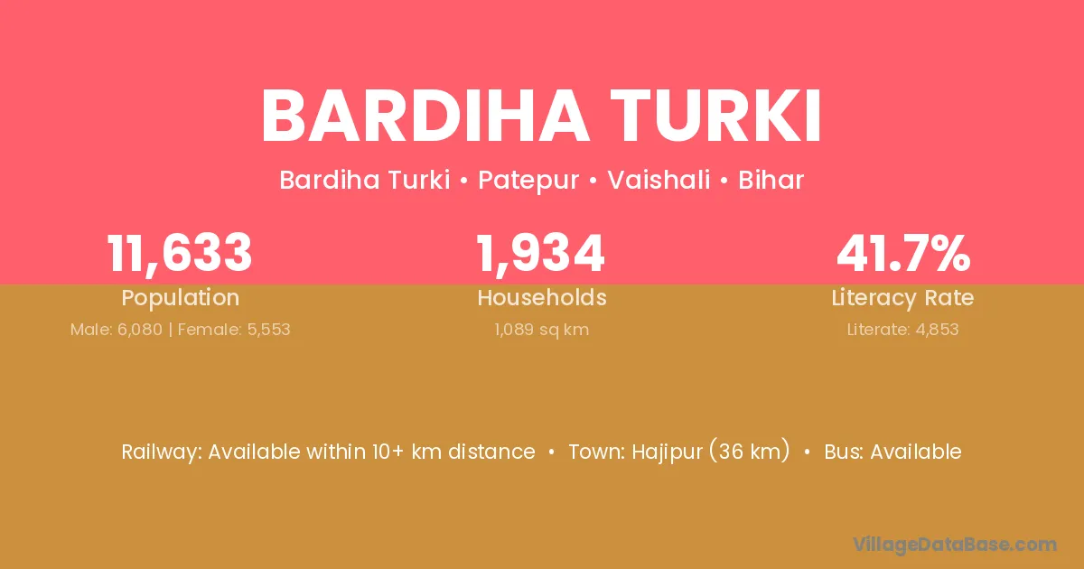 Bardiha Turki village has a total population of 11,633 people, of which 6,080 are males and 5,553 are females.