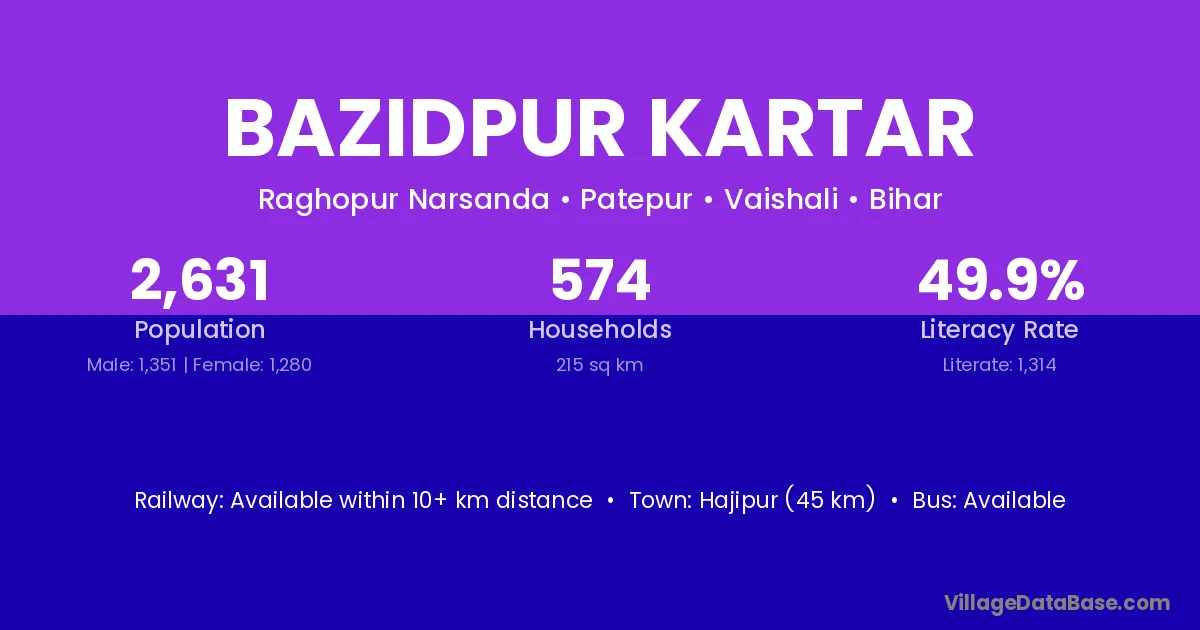 Hajipur (45 km) is the nearest town to Bazidpur Kartar village for major economic activities and is located approximately 45 km away.