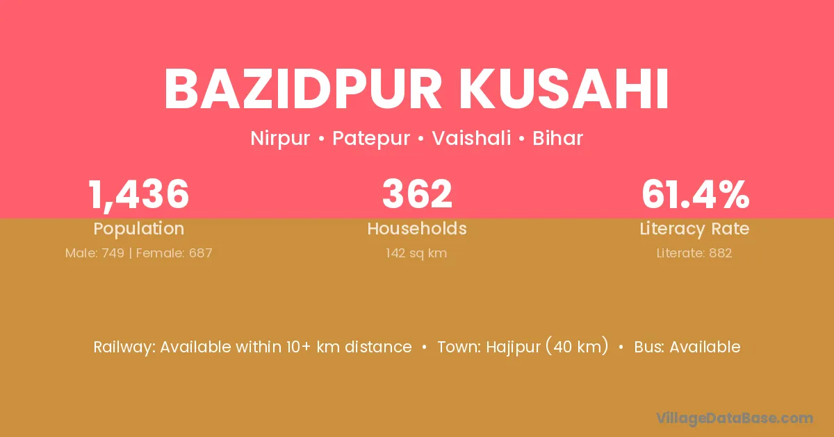 Hajipur (40 km) is the nearest town to Bazidpur Kusahi village for major economic activities and is located approximately 40 km away.
