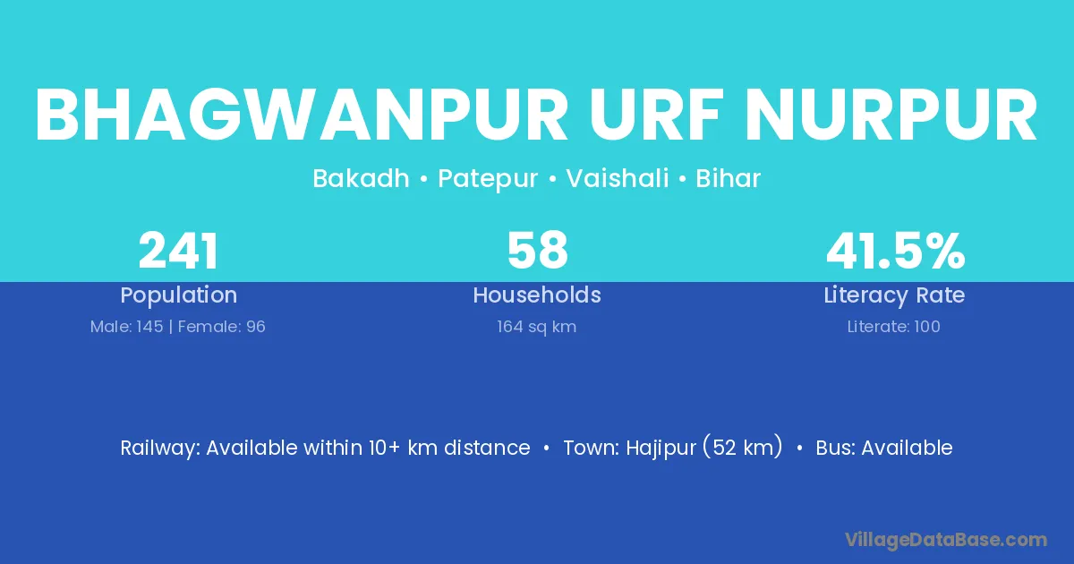 Bhagwanpur Urf Nurpur village has a total population of 241 people, of which 145 are males and 96 are females.