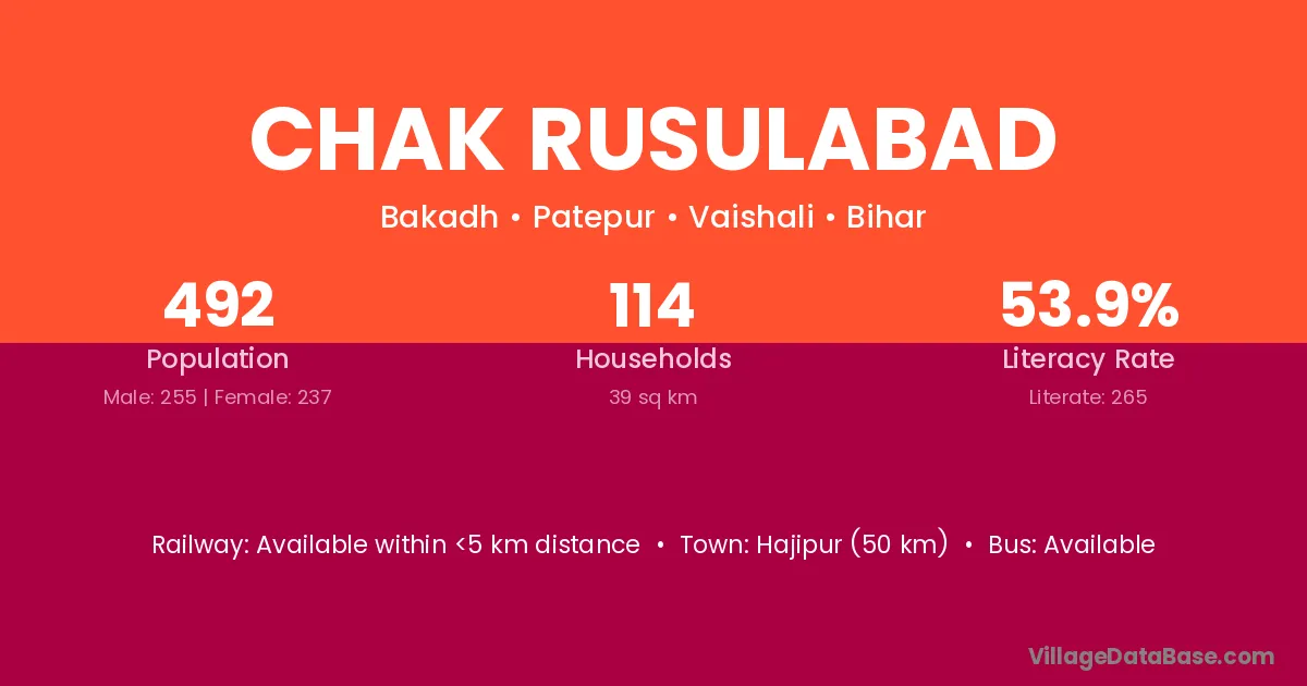 Hajipur (50 km) is the nearest town to Chak Rusulabad village for major economic activities and is located approximately 50 km away.