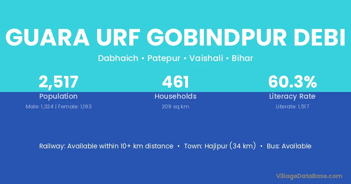 Hajipur (34 km) is the nearest town to Guara Urf Gobindpur Debi village for major economic activities and is located approximately 34 km away.