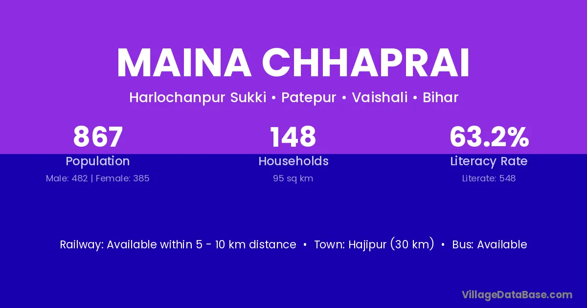 Hajipur (30 km) is the nearest town to Maina Chhaprai village for major economic activities and is located approximately 30 km away.