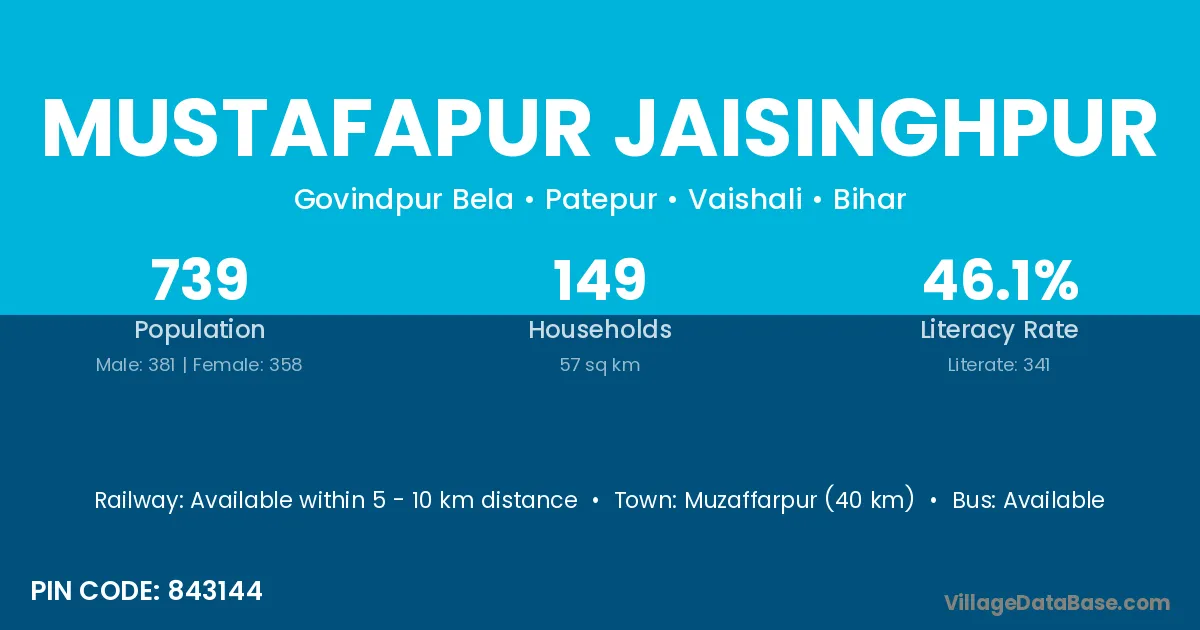 Mustafapur Jaisinghpur village has a total population of 739 people, of which 381 are males and 358 are females.