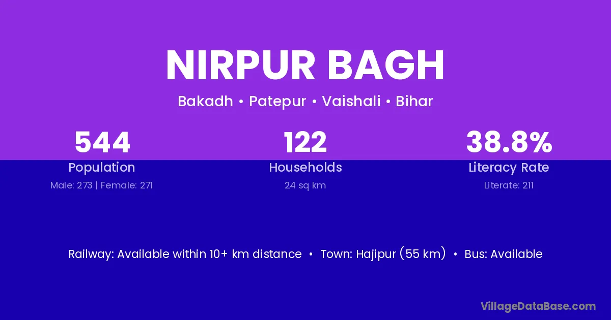 Nirpur Bagh village has a total population of 544 people, of which 273 are males and 271 are females.