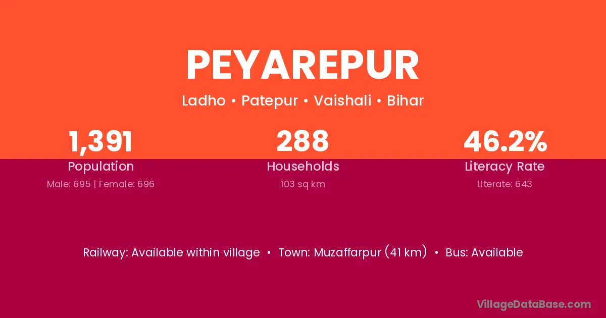 Muzaffarpur (41 km) is the nearest town to Peyarepur village for major economic activities and is located approximately 41 km away.