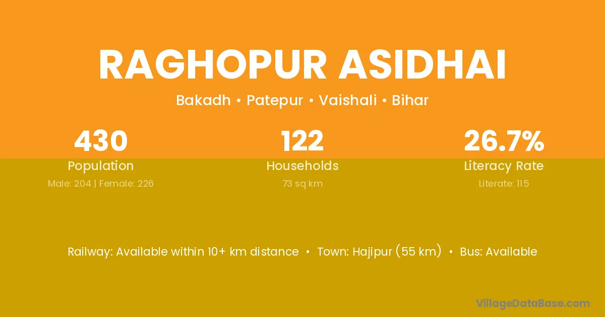 Raghopur Asidhai village has a total population of 430 people, of which 204 are males and 226 are females.