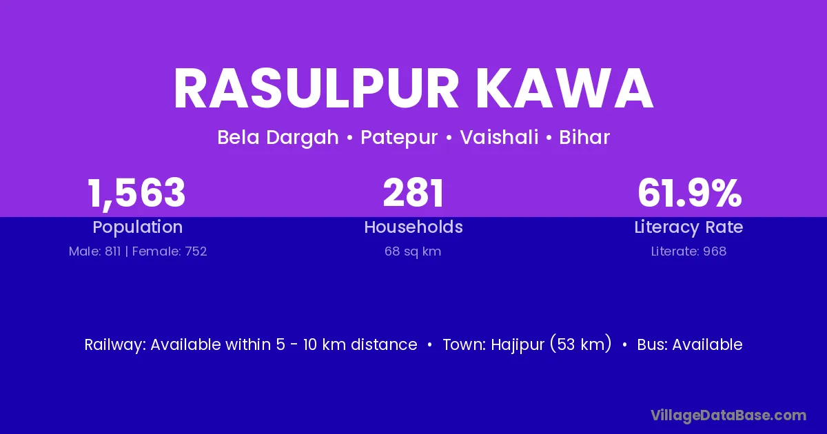 Hajipur (53 km) is the nearest town to Rasulpur Kawa village for major economic activities and is located approximately 53 km away.