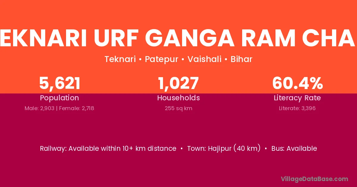 Hajipur (40 km) is the nearest town to Teknari Urf Ganga Ram Chak village for major economic activities and is located approximately 40 km away.