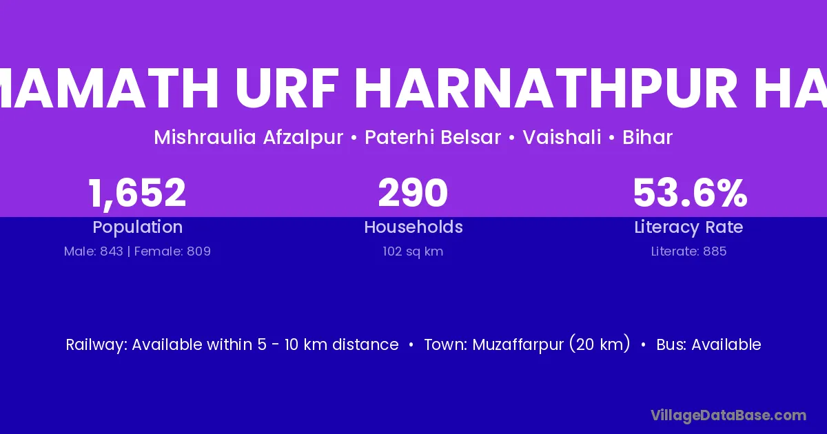Muzaffarpur (20 km) is the nearest town to Birmamath Urf Harnathpur Harna village for major economic activities and is located approximately 20 km away.