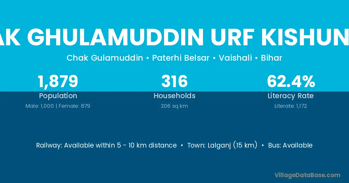Lalganj (15 km) is the nearest town to Chak Ghulamuddin Urf Kishunpur village for major economic activities and is located approximately 15 km away.