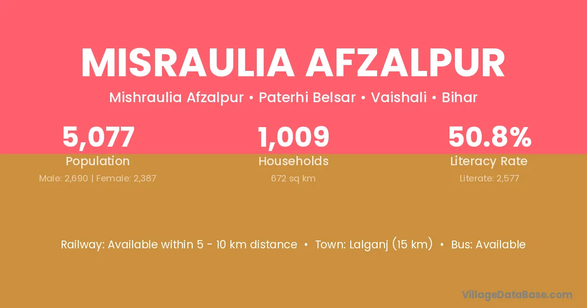 Misraulia Afzalpur village has a total population of 5,077 people, of which 2,690 are males and 2,387 are females.