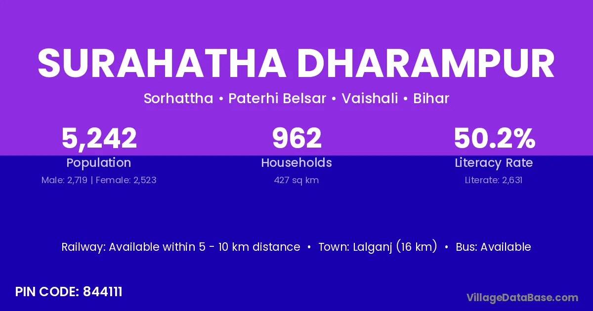 Lalganj (16 km) is the nearest town to Surahatha Dharampur village for major economic activities and is located approximately 16 km away.