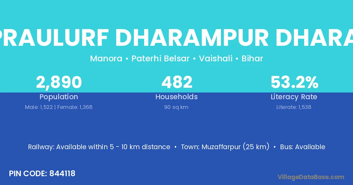 Muzaffarpur (25 km) is the nearest town to Upraulurf Dharampur Dharam village for major economic activities and is located approximately 25 km away.