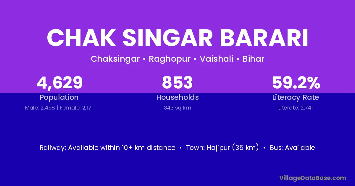 Hajipur (35 km) is the nearest town to Chak Singar Barari village for major economic activities and is located approximately 35 km away.