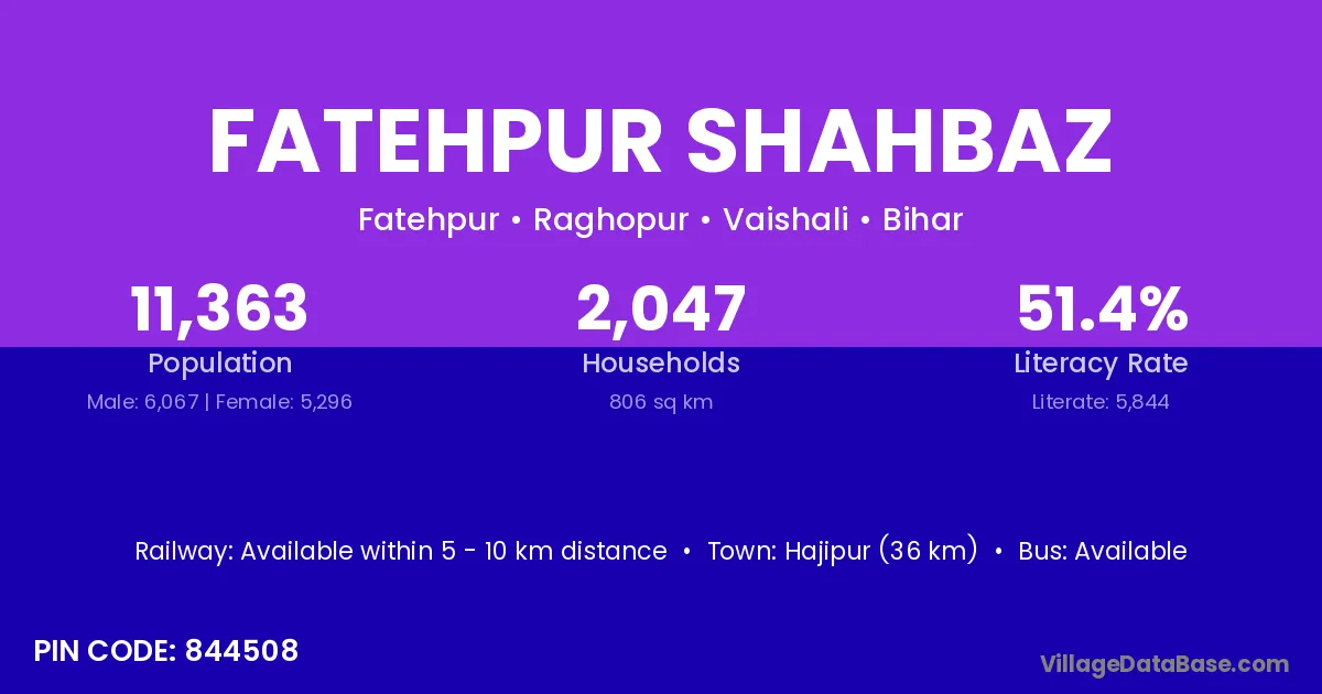 Hajipur (36 km) is the nearest town to Fatehpur Shahbaz village for major economic activities and is located approximately 36 km away.