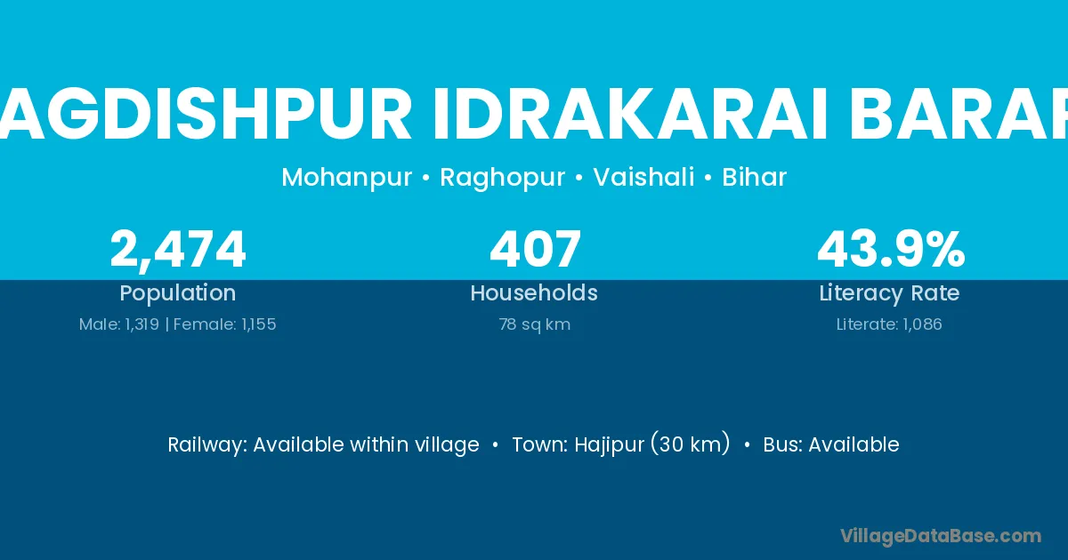 Hajipur (30 km) is the nearest town to Jagdishpur Idrakarai Barari village for major economic activities and is located approximately 30 km away.