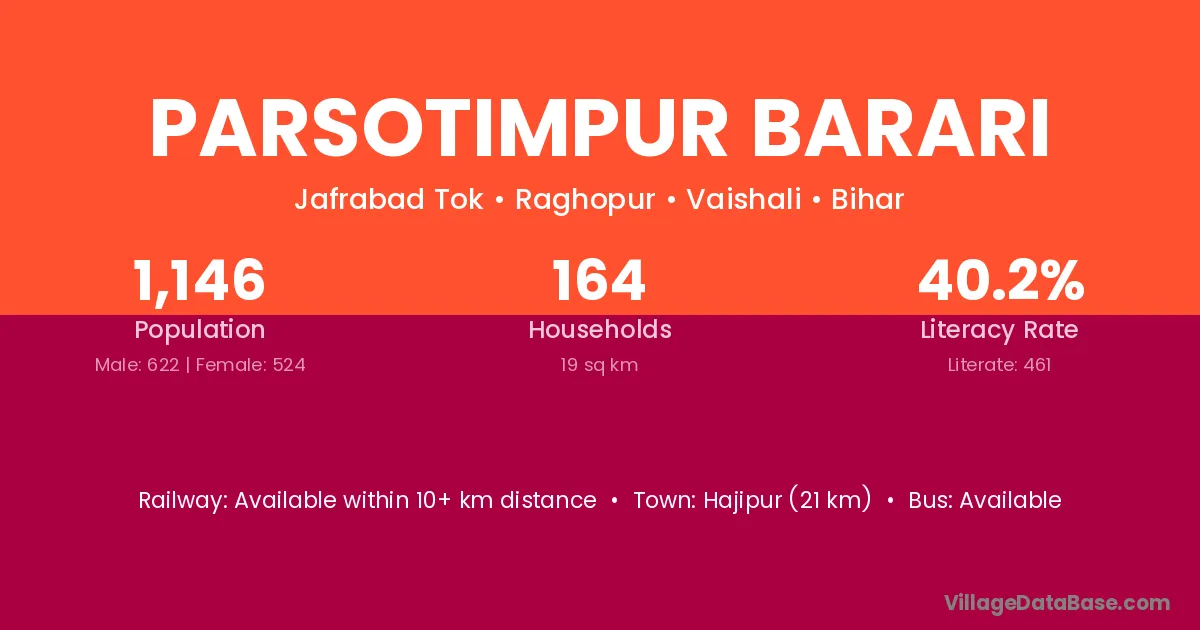 Hajipur (21 km) is the nearest town to Parsotimpur Barari village for major economic activities and is located approximately 21 km away.