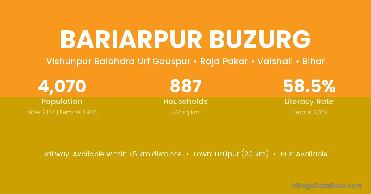 Hajipur (20 km) is the nearest town to Bariarpur Buzurg village for major economic activities and is located approximately 20 km away.