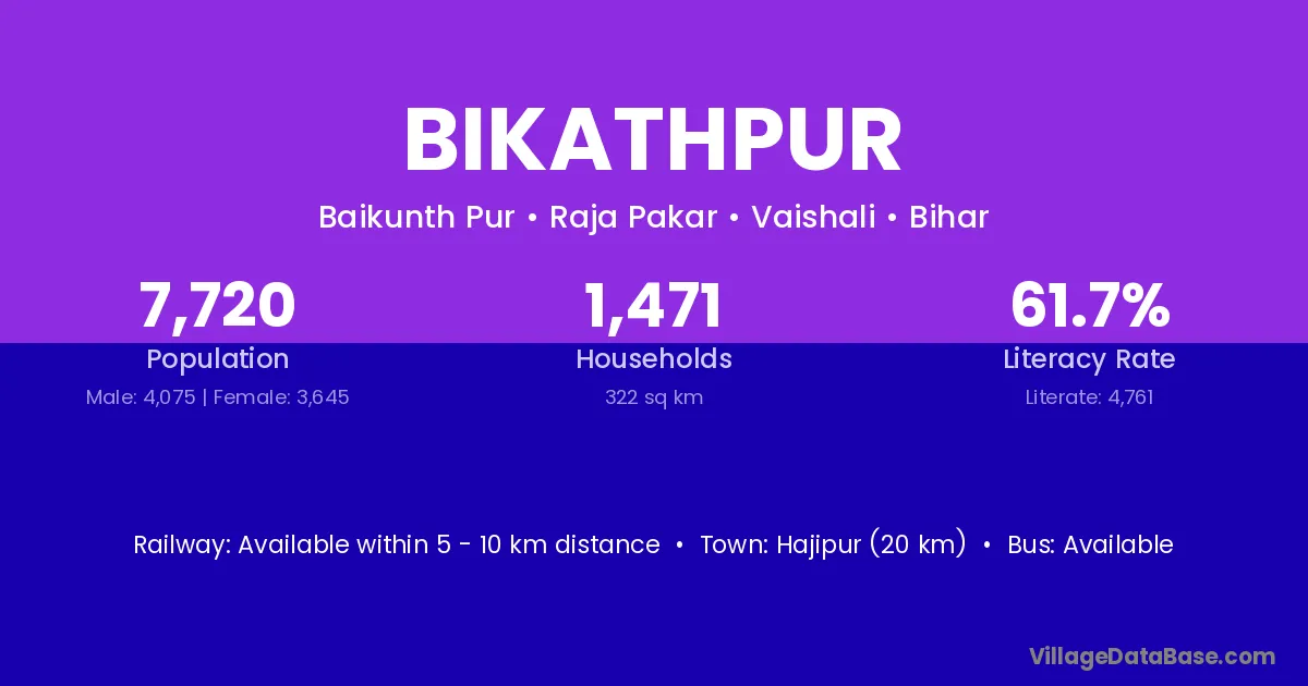 Hajipur (20 km) is the nearest town to Bikathpur village for major economic activities and is located approximately 20 km away.