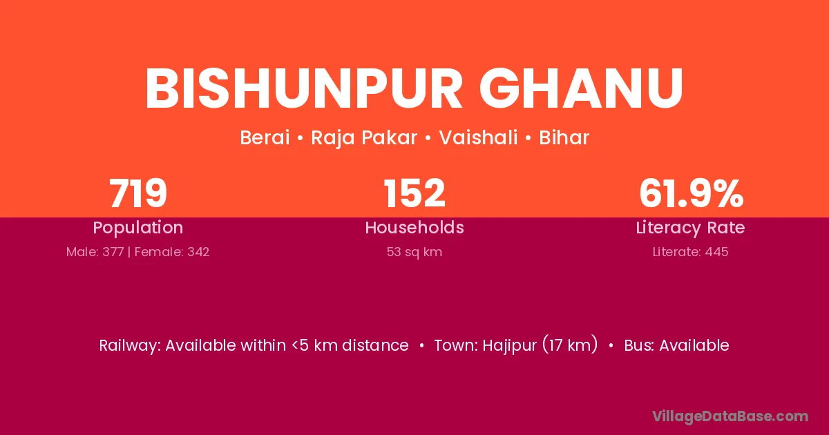 Hajipur (17 km) is the nearest town to Bishunpur Ghanu village for major economic activities and is located approximately 17 km away.
