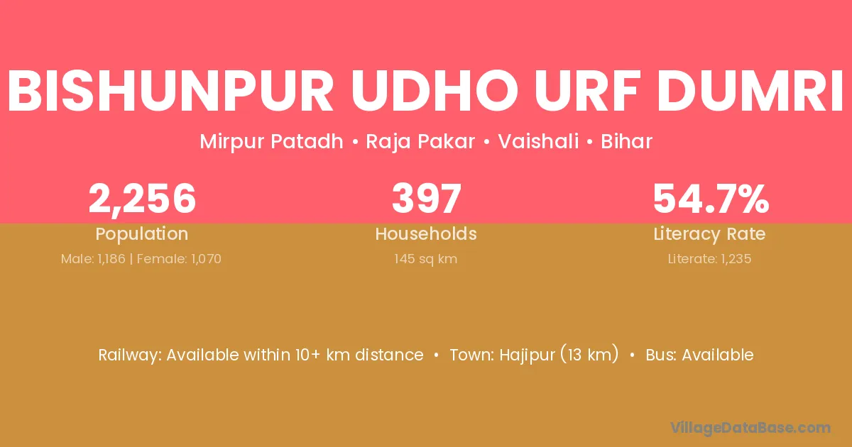 Bishunpur Udho Urf Dumri village has a total population of 2,256 people, of which 1,186 are males and 1,070 are females.