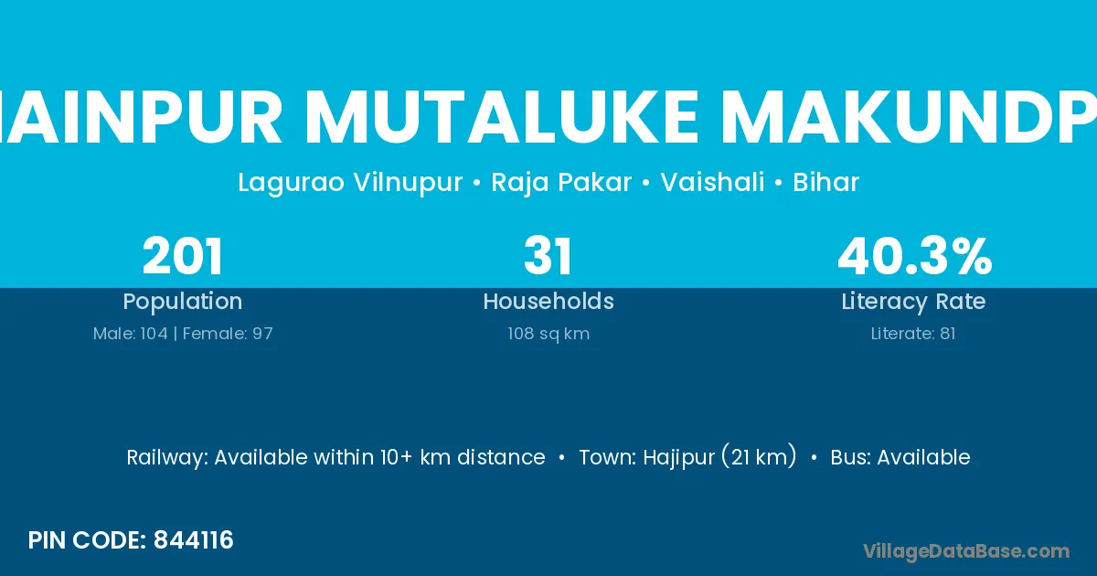 Hajipur (21 km) is the nearest town to Chainpur Mutaluke Makundpur village for major economic activities and is located approximately 21 km away.