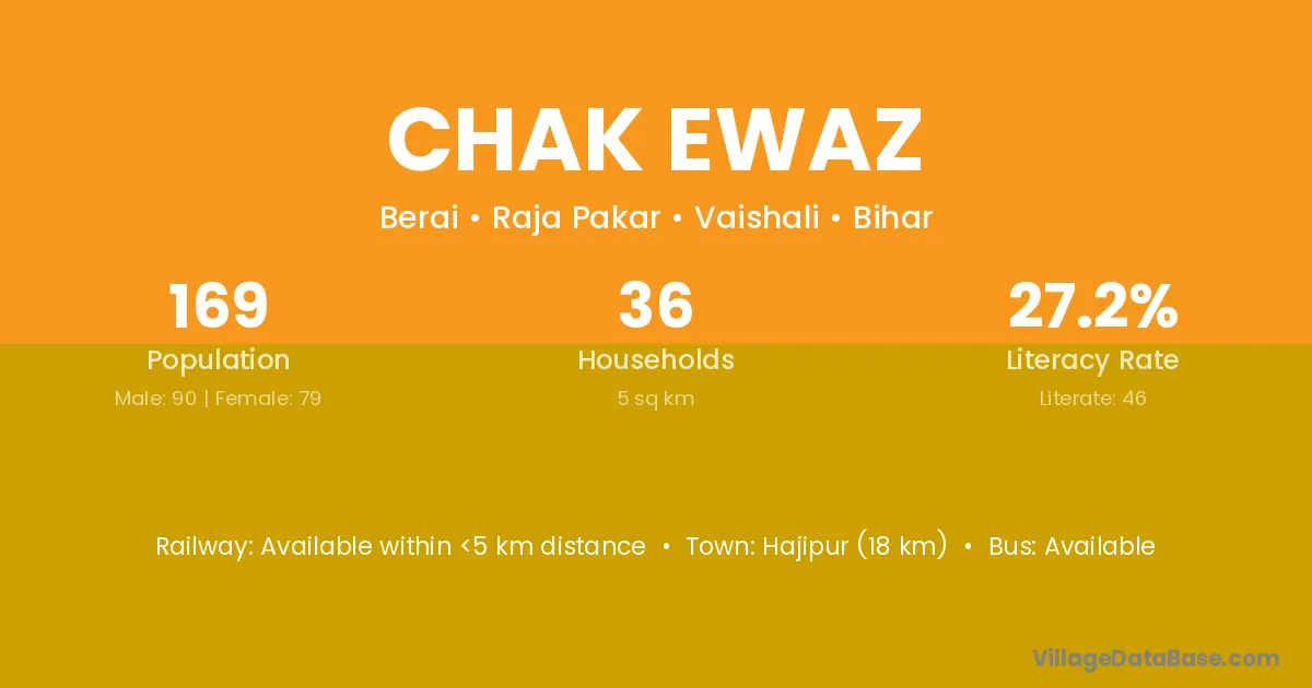 Hajipur (18 km) is the nearest town to Chak Ewaz village for major economic activities and is located approximately 18 km away.