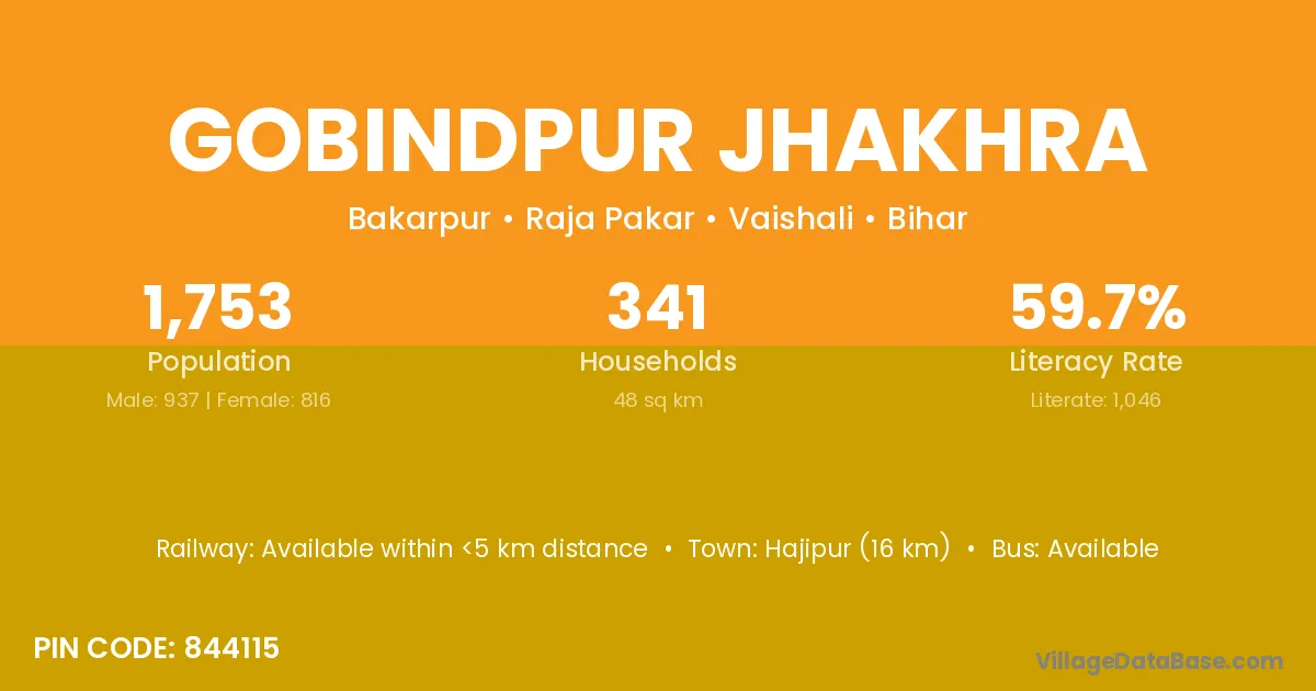 Hajipur (16 km) is the nearest town to Gobindpur Jhakhra village for major economic activities and is located approximately 16 km away.