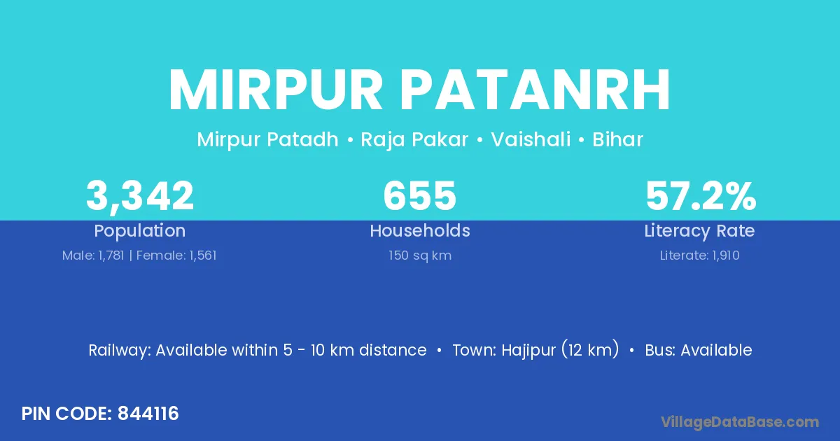 Hajipur (12 km) is the nearest town to Mirpur Patanrh village for major economic activities and is located approximately 12 km away.