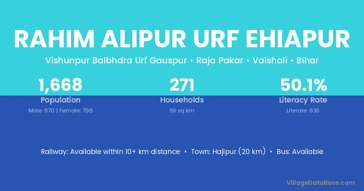 Hajipur (20 km) is the nearest town to Rahim Alipur Urf Ehiapur village for major economic activities and is located approximately 20 km away.