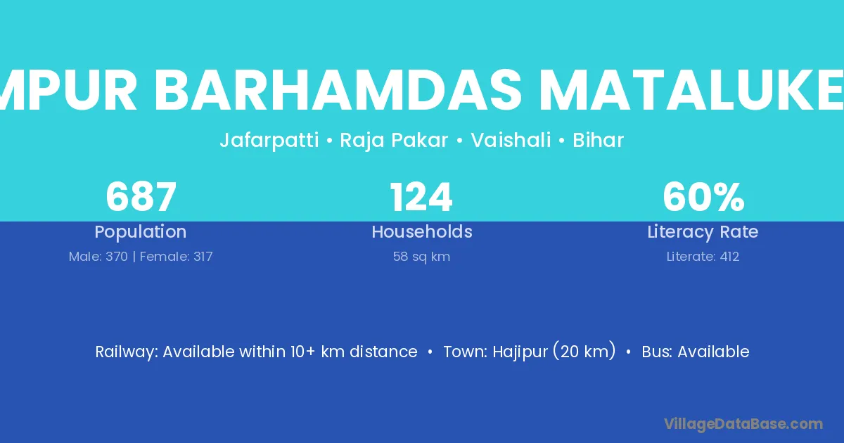 Hajipur (20 km) is the nearest town to Rampur Barhamdas Mataluke Bis village for major economic activities and is located approximately 20 km away.