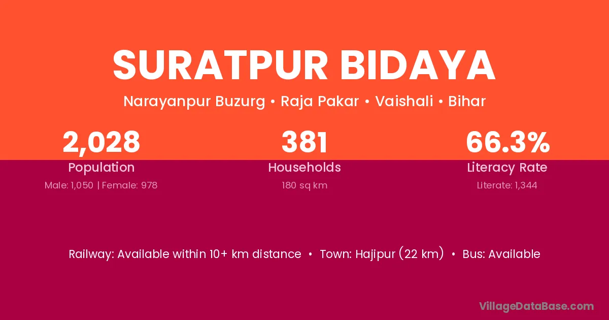 Hajipur (22 km) is the nearest town to Suratpur Bidaya village for major economic activities and is located approximately 22 km away.