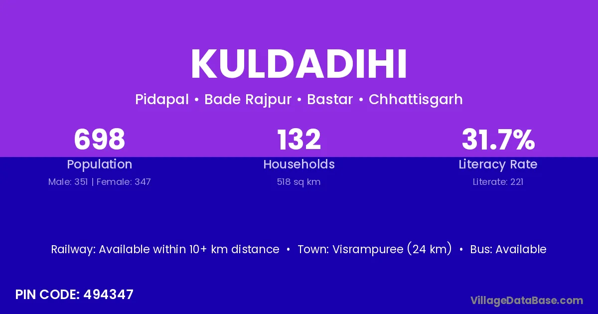 Kuldadihi village has a total population of 698 people, of which 351 are males and 347 are females.