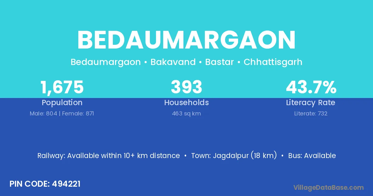 Jagdalpur (18 km) is the nearest town to Bedaumargaon village for major economic activities and is located approximately 18 km away.
