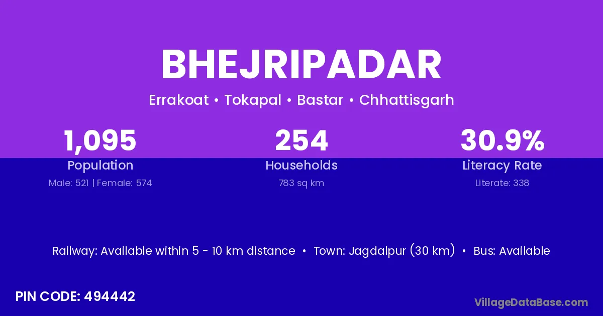Jagdalpur (20 km) is the nearest town to Bhejripadar village for major economic activities and is located approximately 20 km away.
