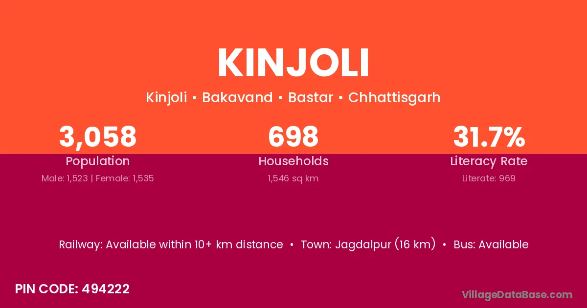 Jagdalpur (16 km) is the nearest town to Kinjoli village for major economic activities and is located approximately 16 km away.