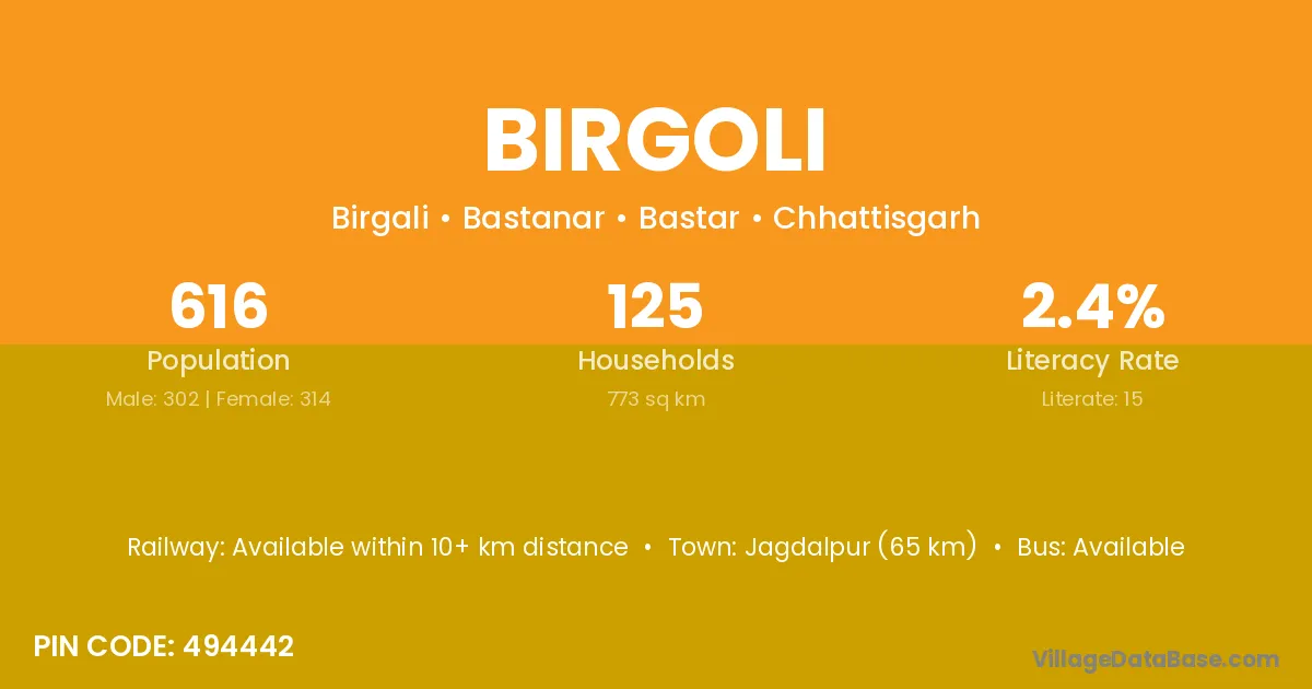 Jagdalpur (65 km) is the nearest town to Birgoli village for major economic activities and is located approximately 65 km away.