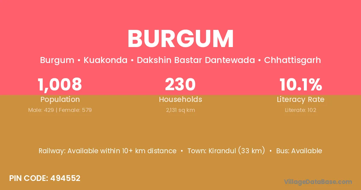 Jagdalpur (72 km) is the nearest town to Burgum village for major economic activities and is located approximately 72 km away.