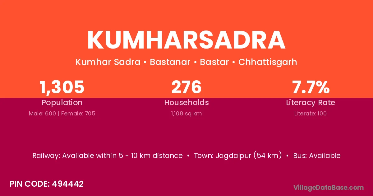 Jagdalpur (54 km) is the nearest town to Kumharsadra village for major economic activities and is located approximately 54 km away.