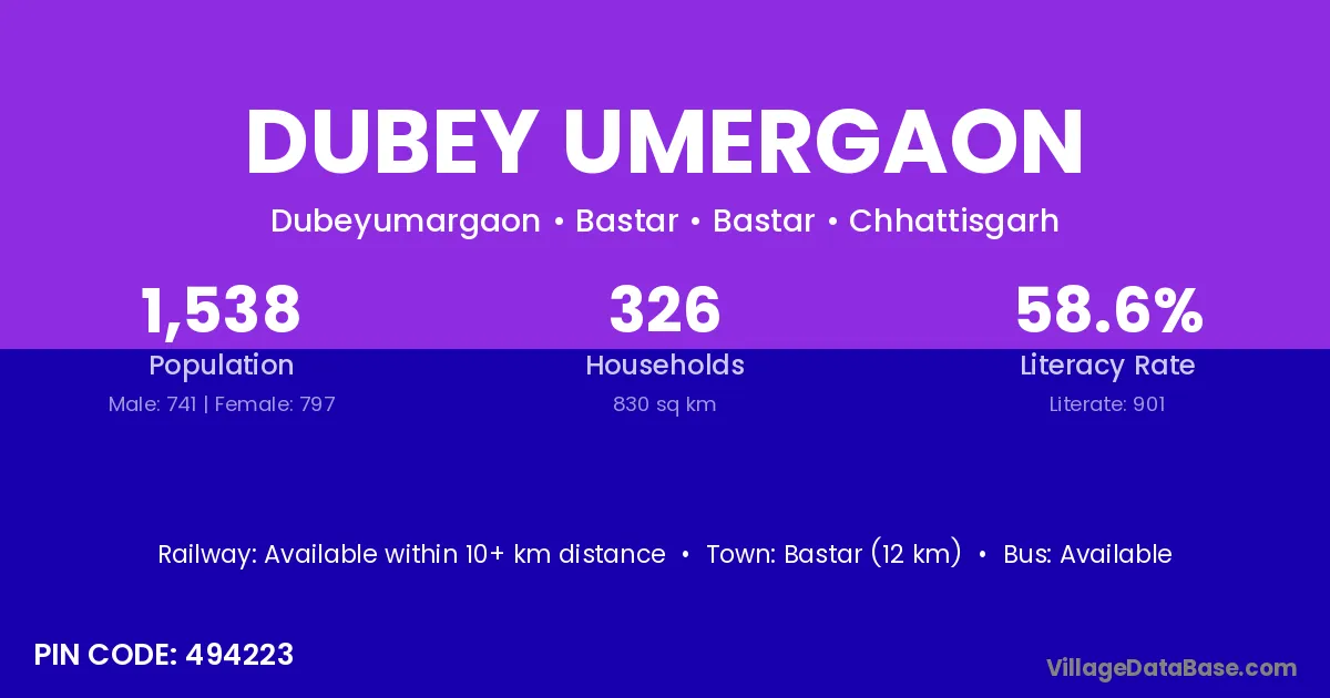 Bastar (12 km) is the nearest town to Dubey Umergaon village for major economic activities and is located approximately 12 km away.