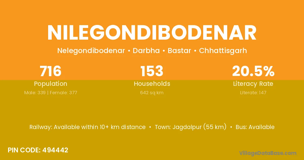 Jagdalpur (55 km) is the nearest town to Nilegondibodenar village for major economic activities and is located approximately 55 km away.
