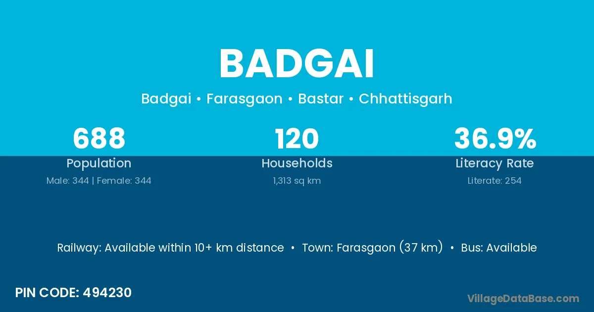 Farasgaon (37 km) is the nearest town to Badgai village for major economic activities and is located approximately 37 km away.
