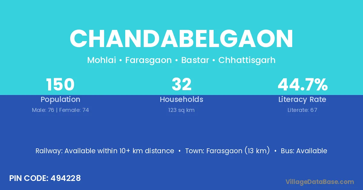 Farasgaon (13 km) is the nearest town to Chandabelgaon village for major economic activities and is located approximately 13 km away.