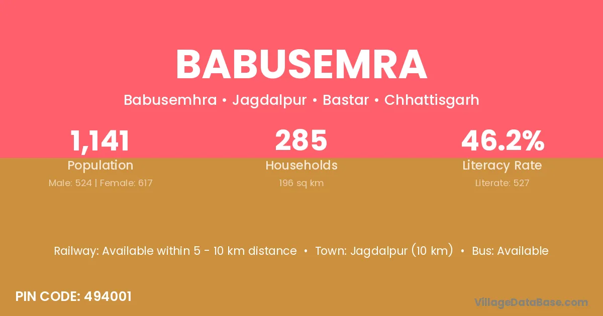 Jagdalpur (10 km) is the nearest town to Babusemra village for major economic activities and is located approximately 10 km away.